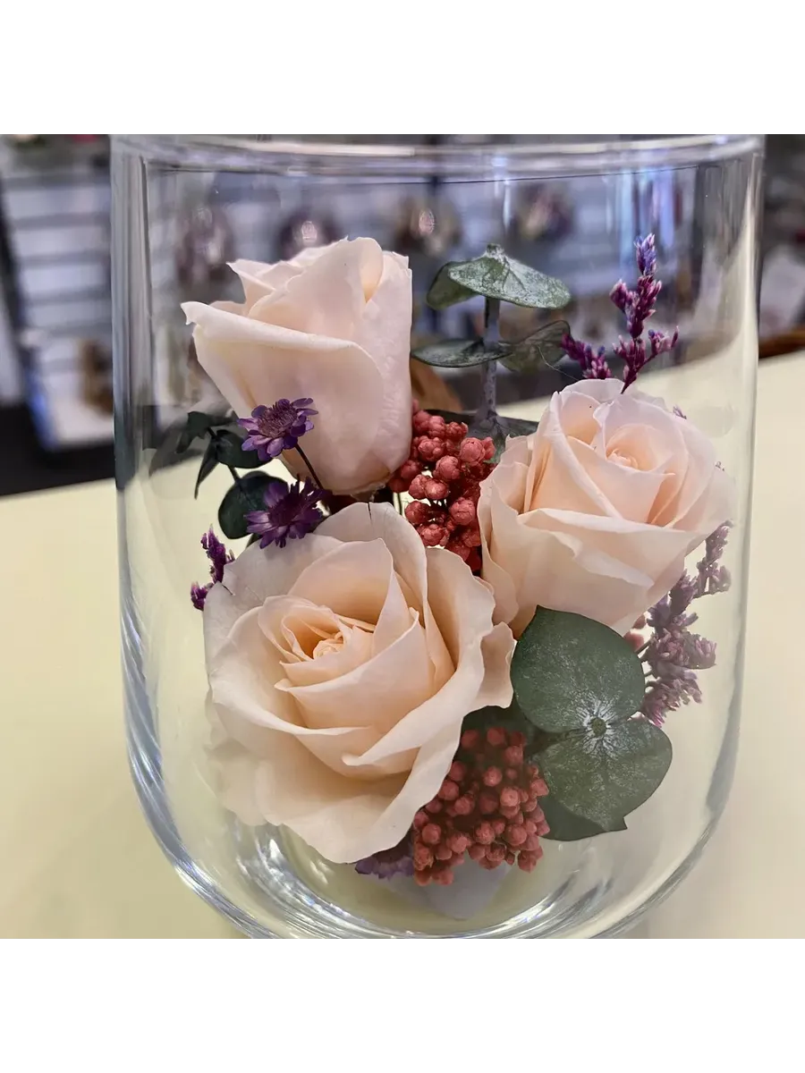 Композиции из натуральных цветов, в стеклянных герметичных вазах, вакуум.