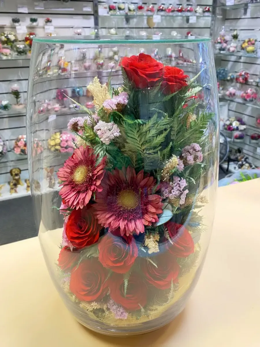 Композиции из натуральных цветов, в стеклянных герметичных вазах, вакуум.
