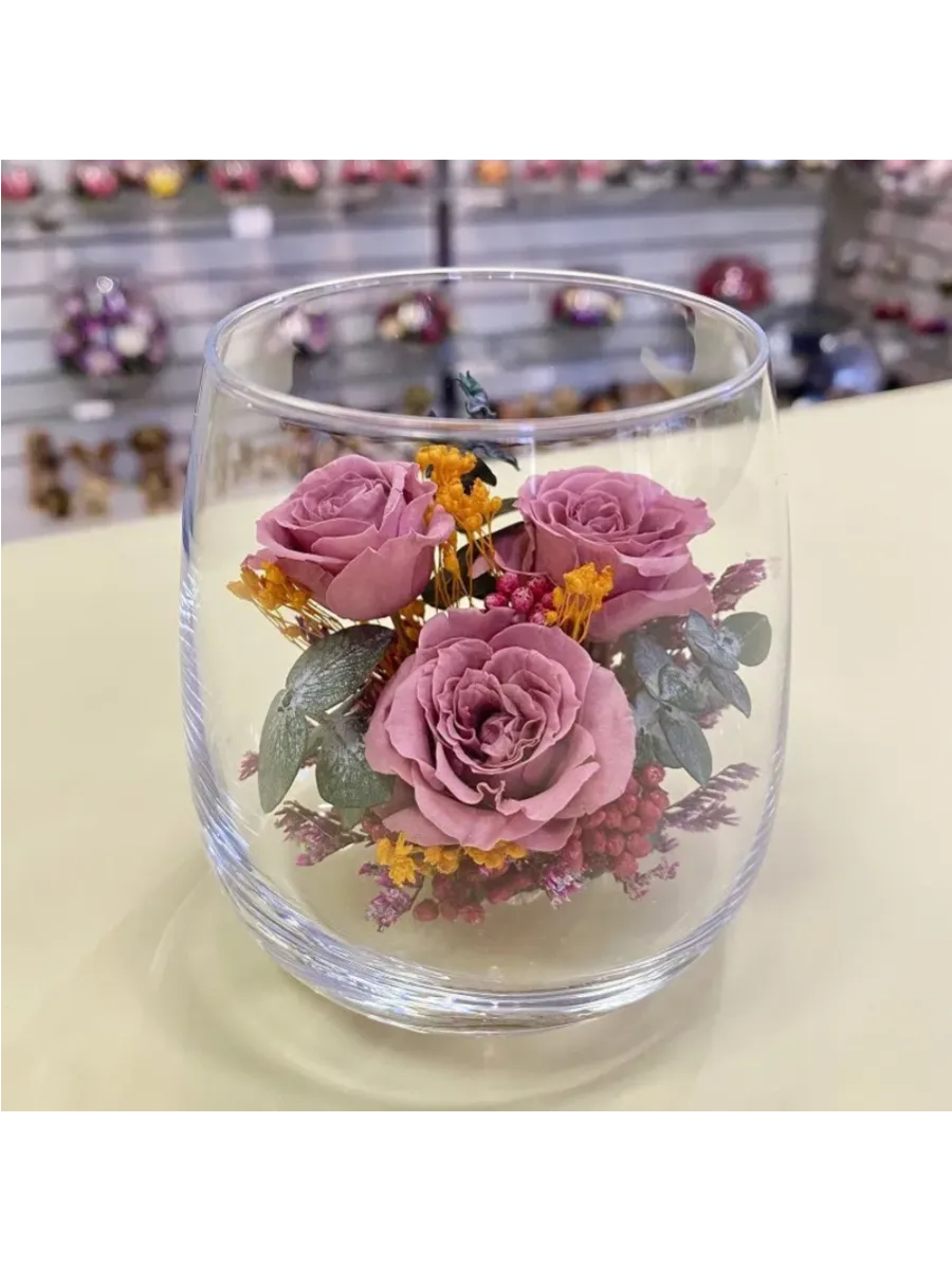 Композиции из натуральных цветов, в стеклянных герметичных вазах, вакуум.