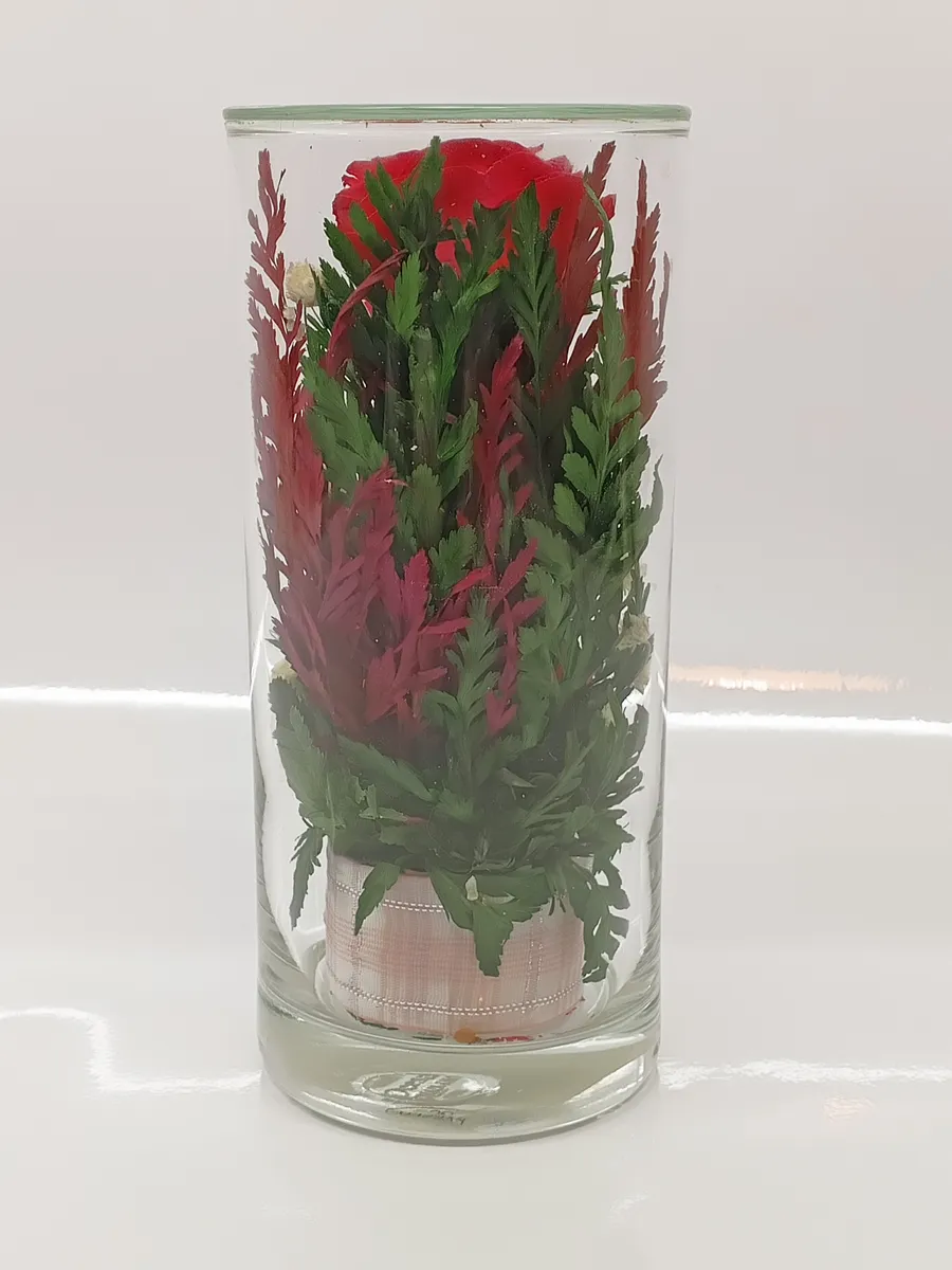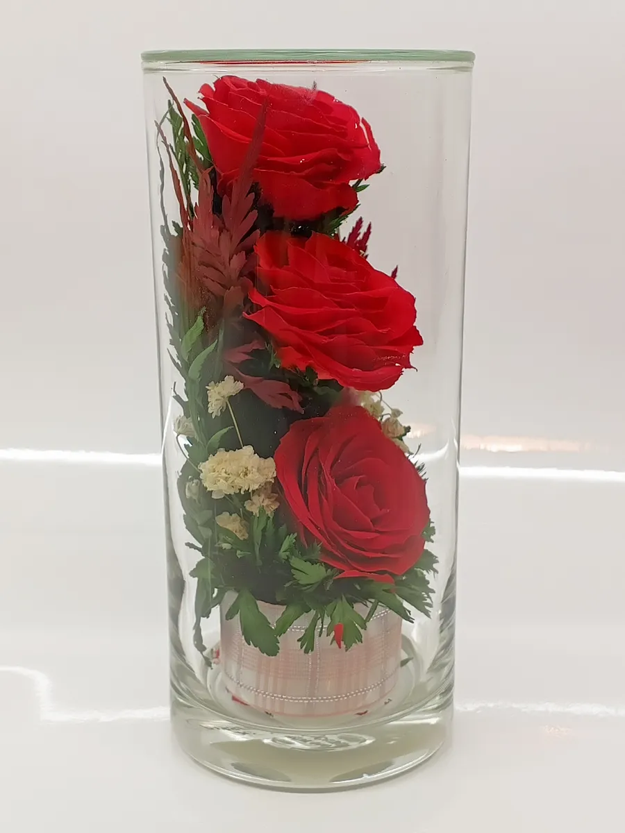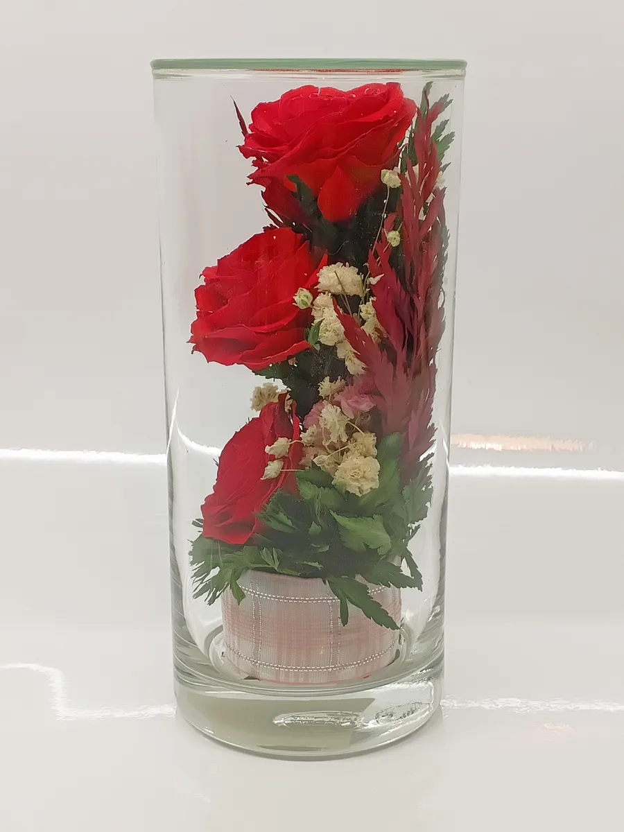 Стекло не только подчеркнет изящество цветов благодаря своей уникальной способности оптического увеличения, но и придаст всей композиции элегантный и утонченный вид.