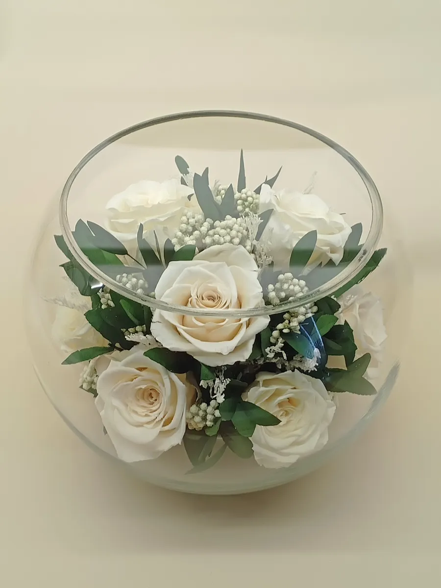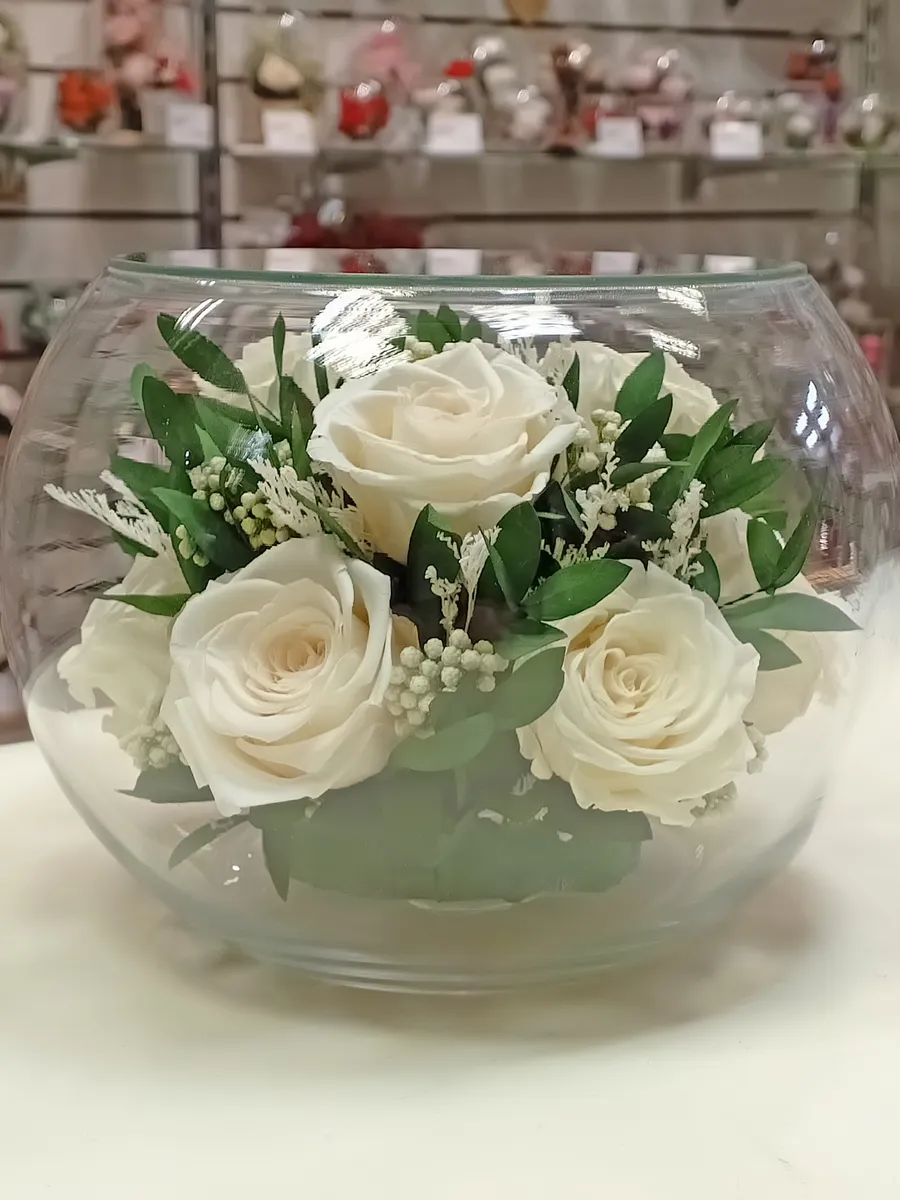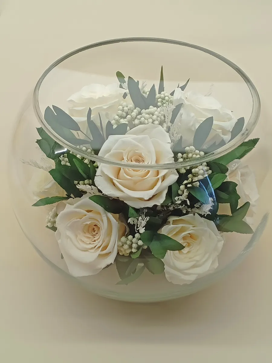 Композиции из натуральных цветов, в стеклянных герметичных вазах, вакуум.