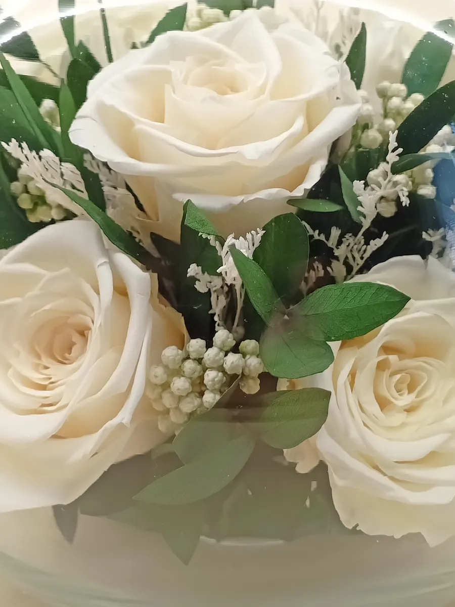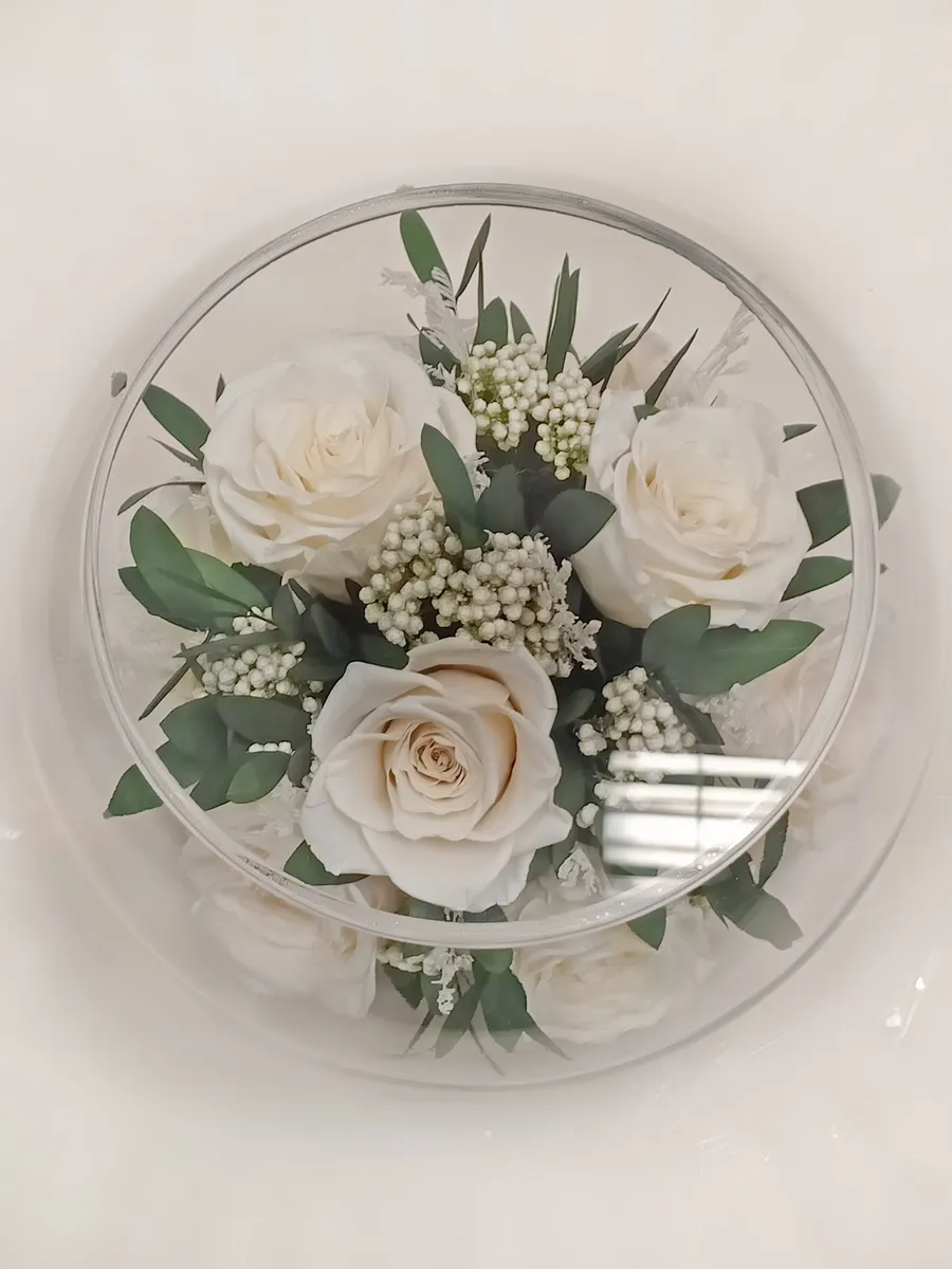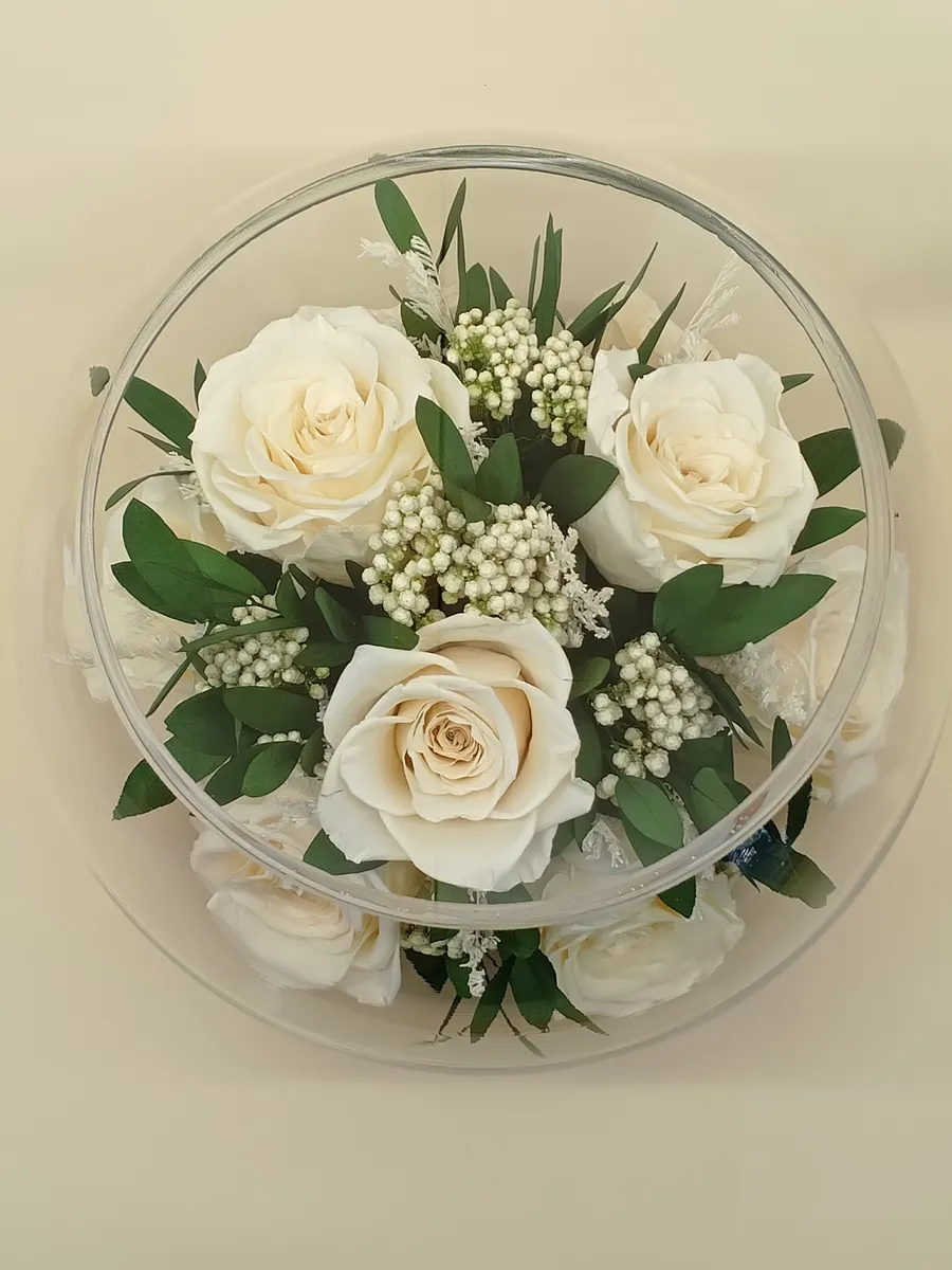 Композиции из натуральных цветов, в стеклянных герметичных вазах, вакуум.