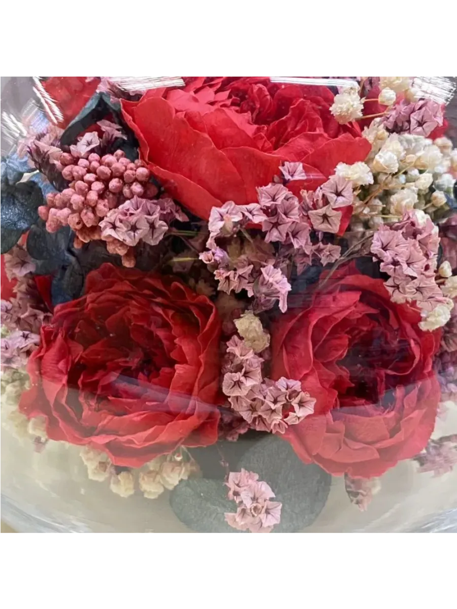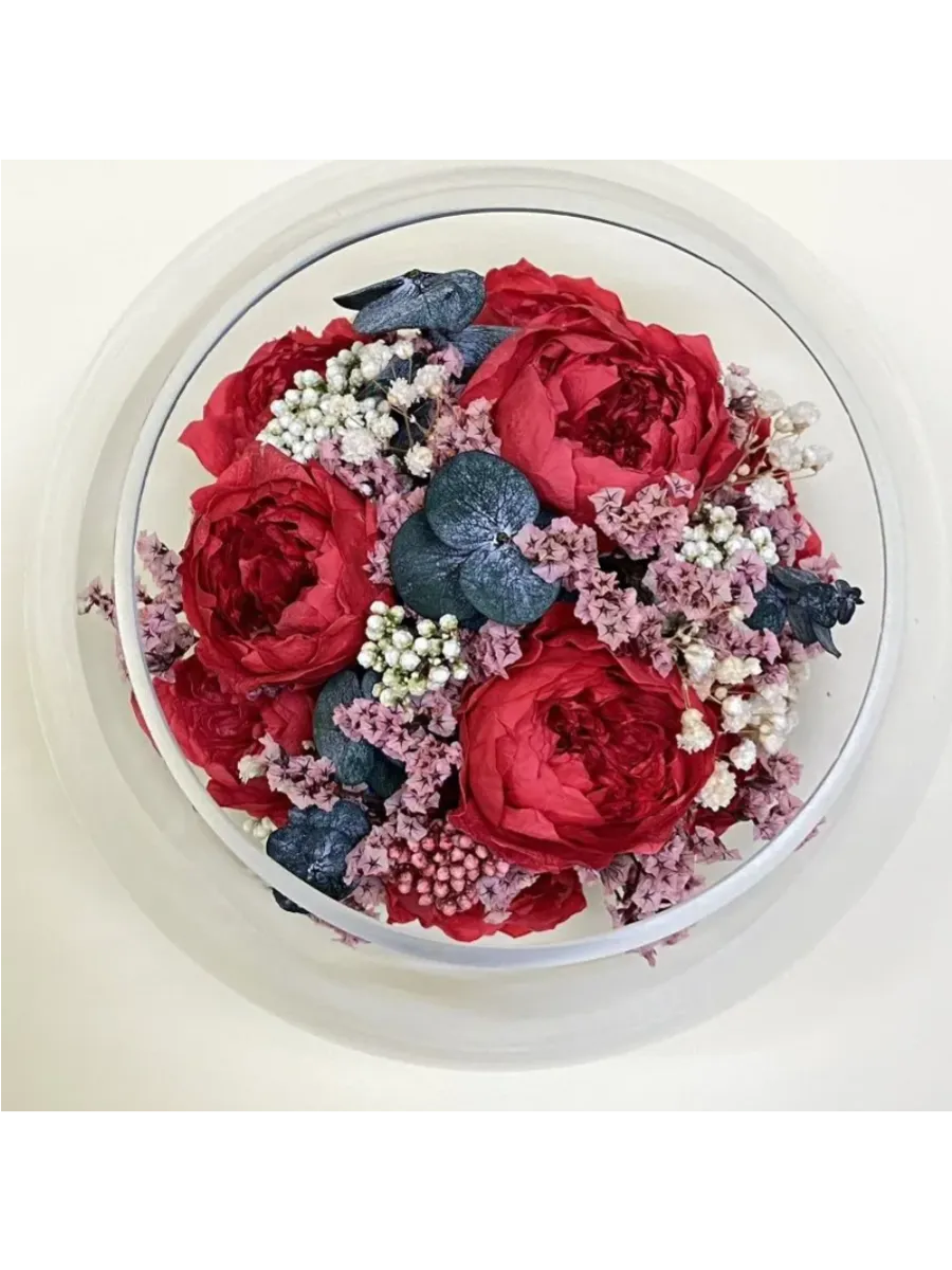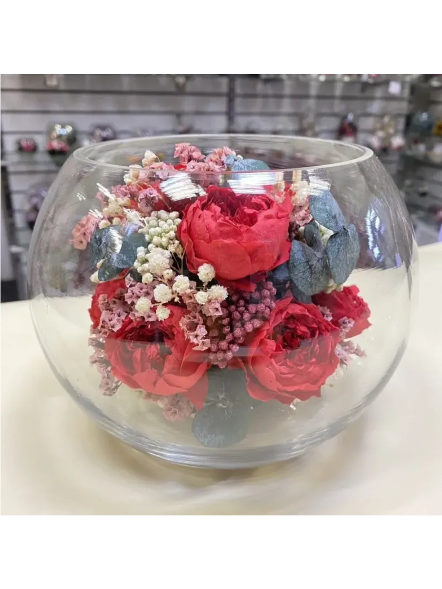 Композиции из натуральных цветов, в стеклянных герметичных вазах, вакуум.