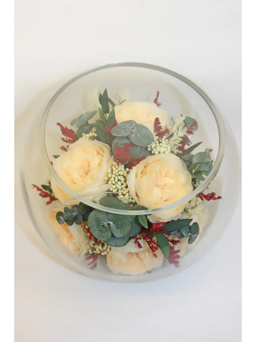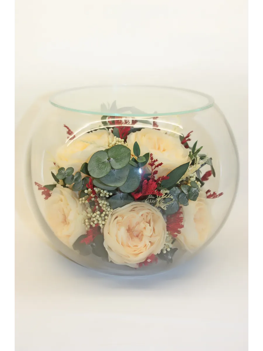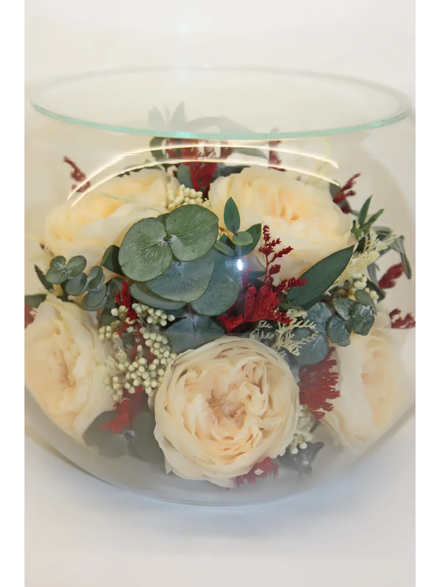 Композиции из натуральных цветов, в стеклянных герметичных вазах, вакуум.