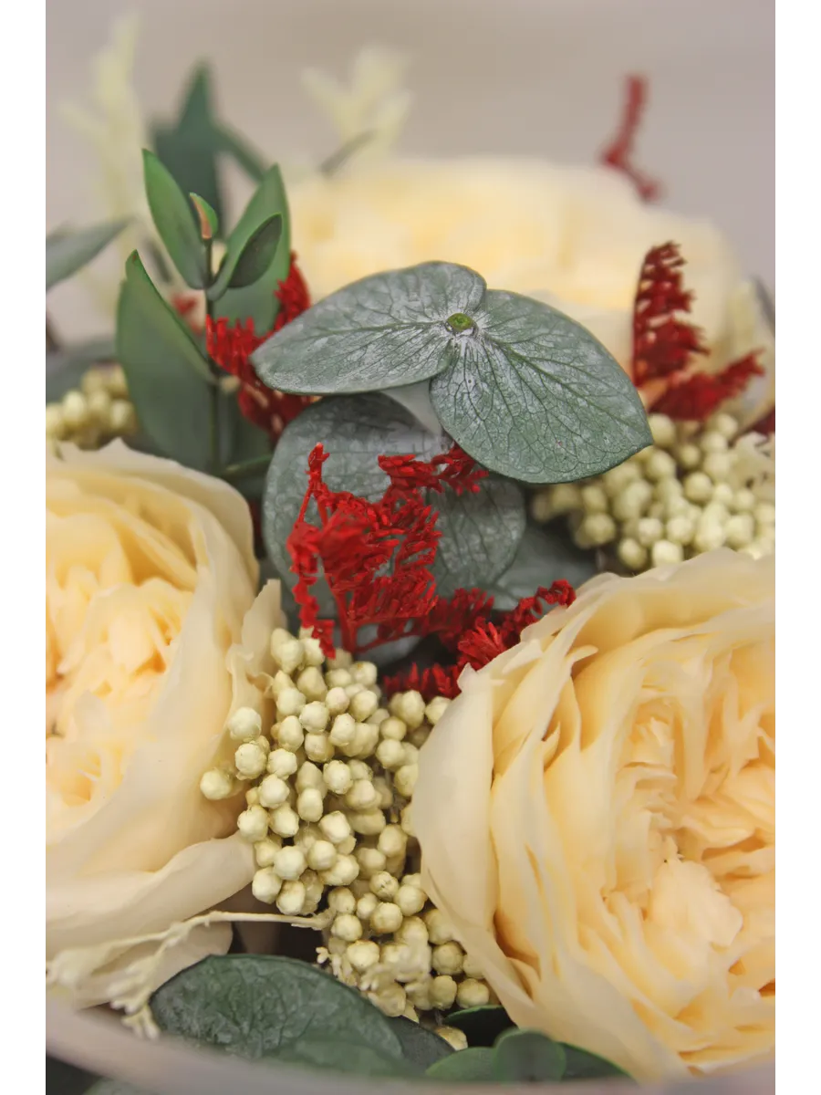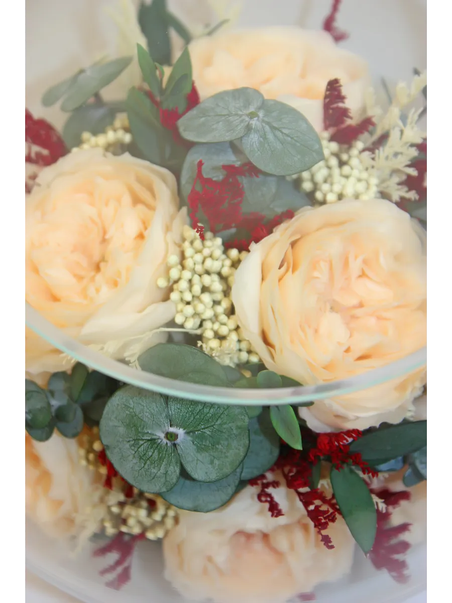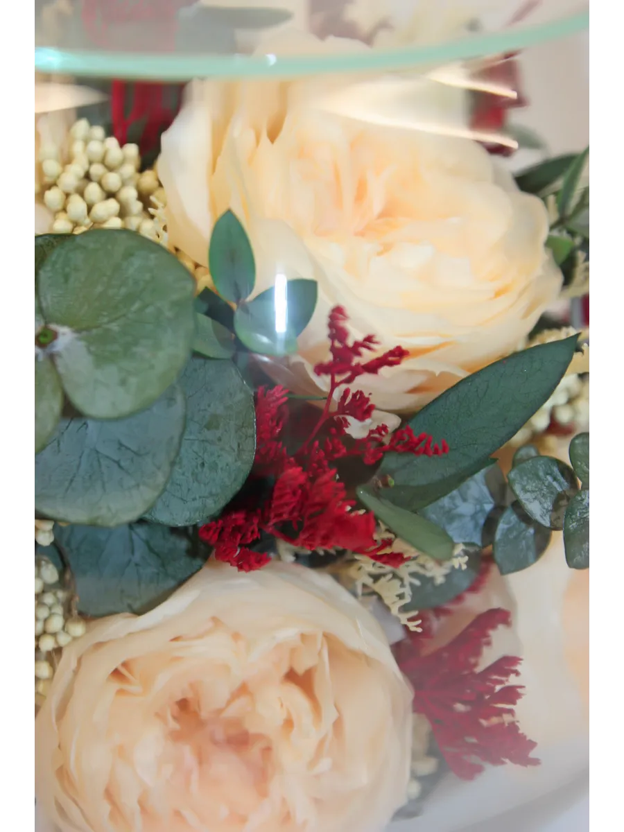 Композиции из натуральных цветов, в стеклянных герметичных вазах, вакуум.