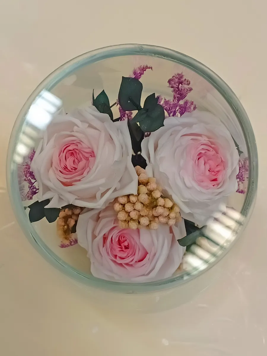 Стекло не только подчеркнет изящество цветов благодаря своей уникальной способности оптического увеличения, но и придаст всей композиции элегантный и утонченный вид.