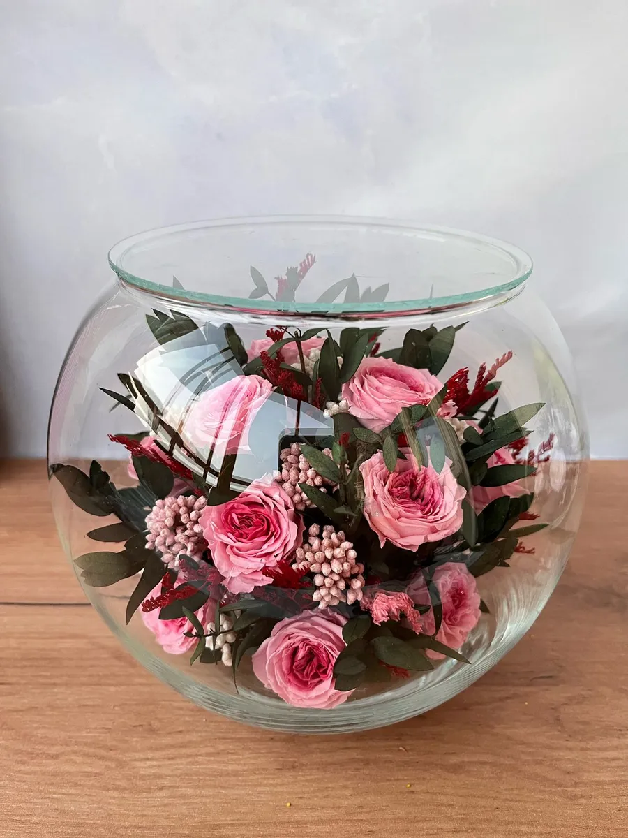 Композиции из натуральных цветов, в стеклянных герметичных вазах, вакуум.