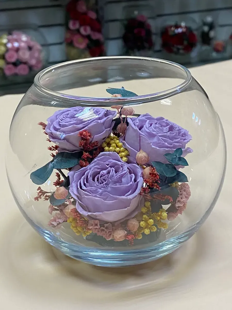 Композиции из натуральных цветов, в стеклянных герметичных вазах, вакуум.