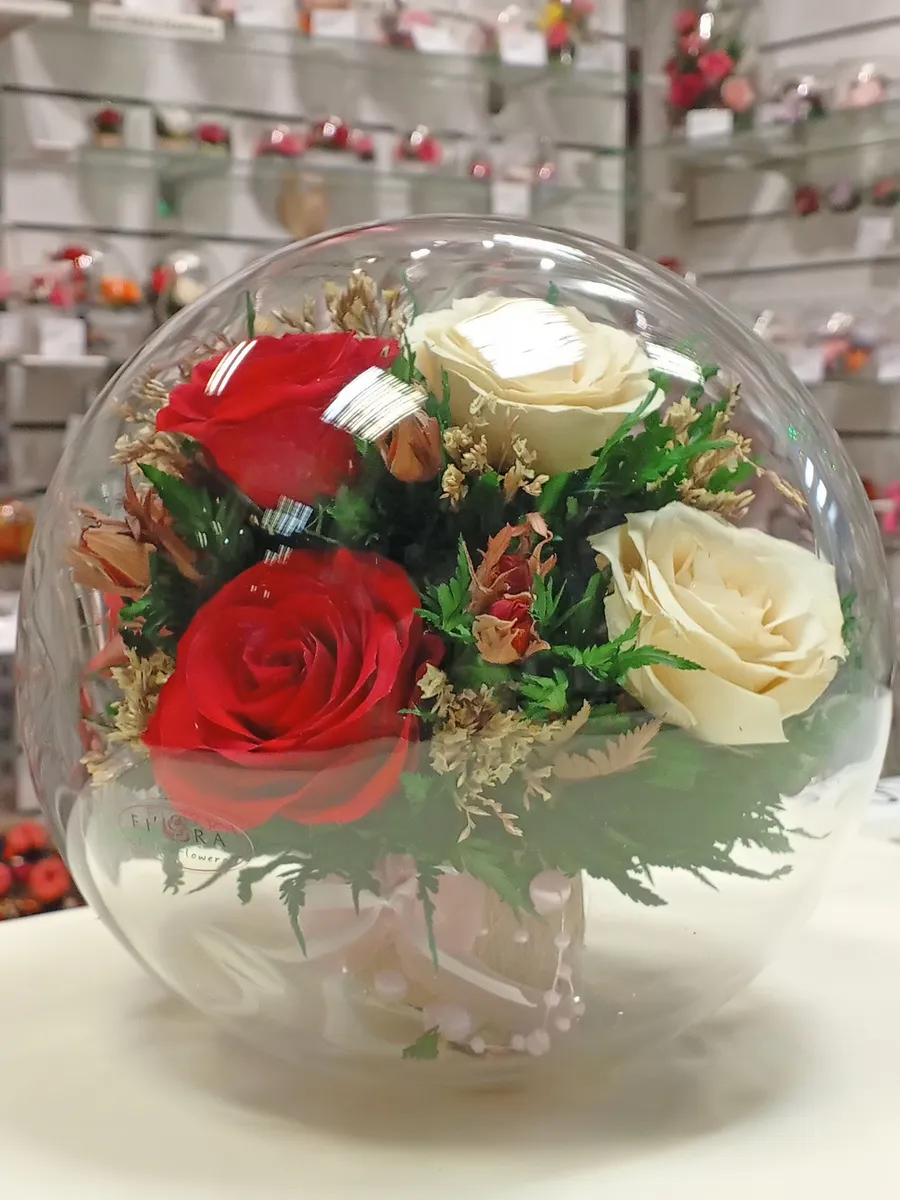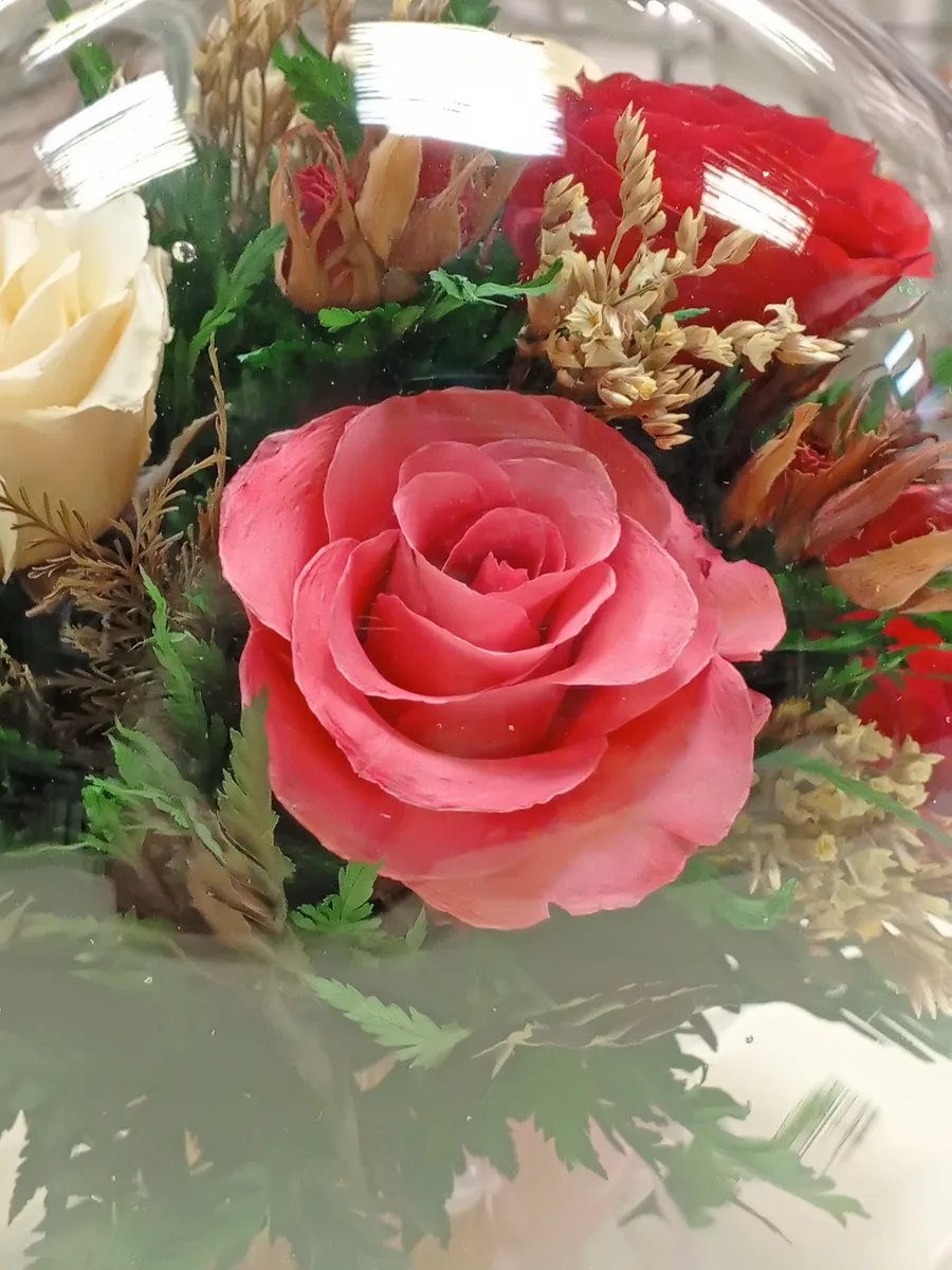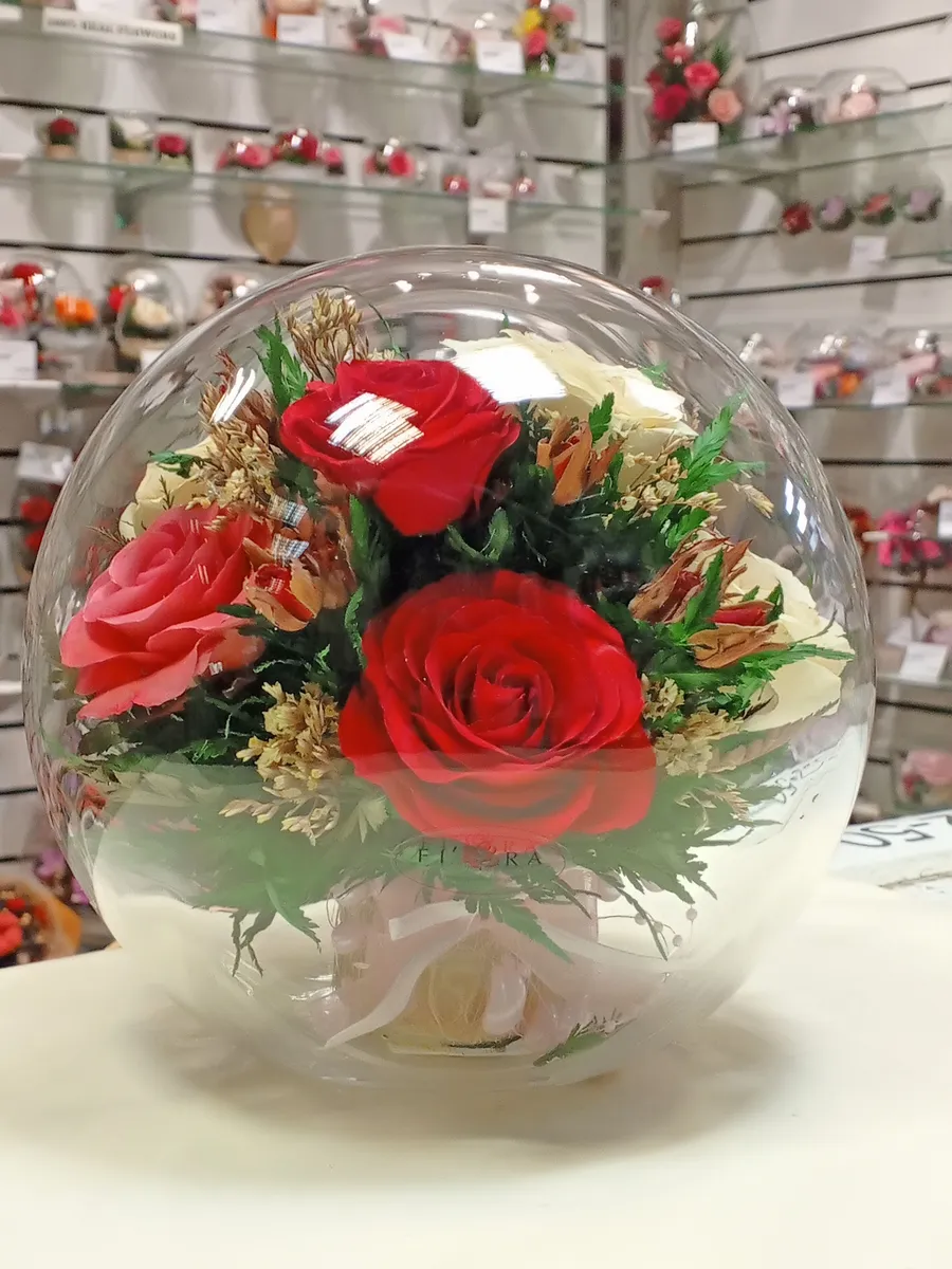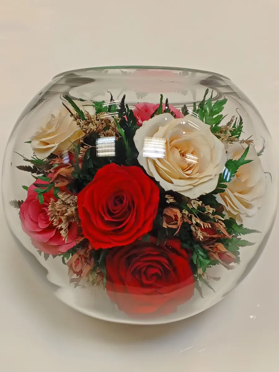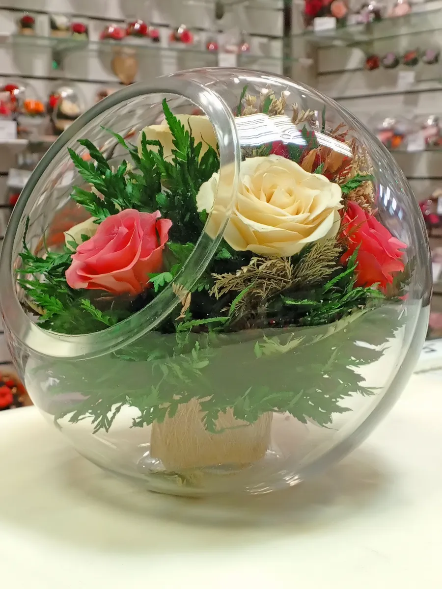 Композиции из натуральных цветов, в стеклянных герметичных вазах, вакуум.