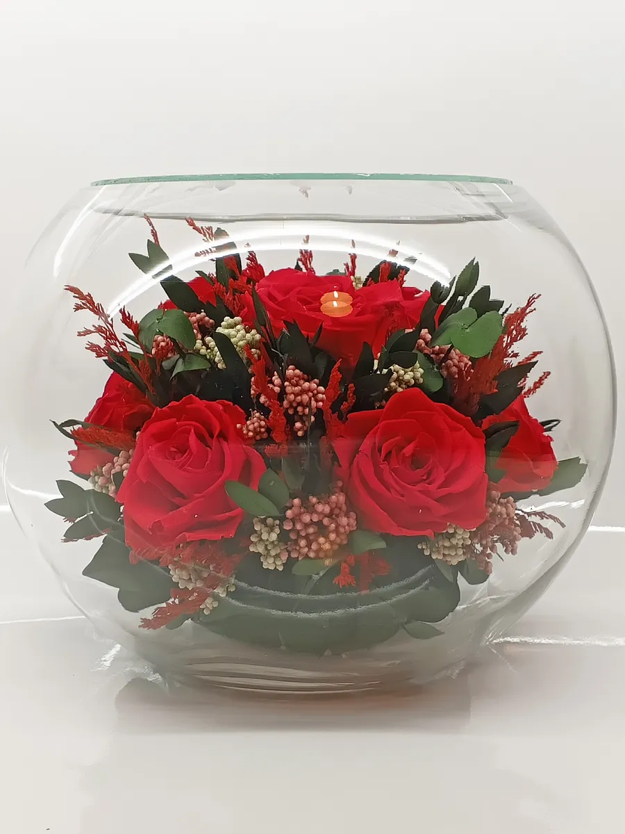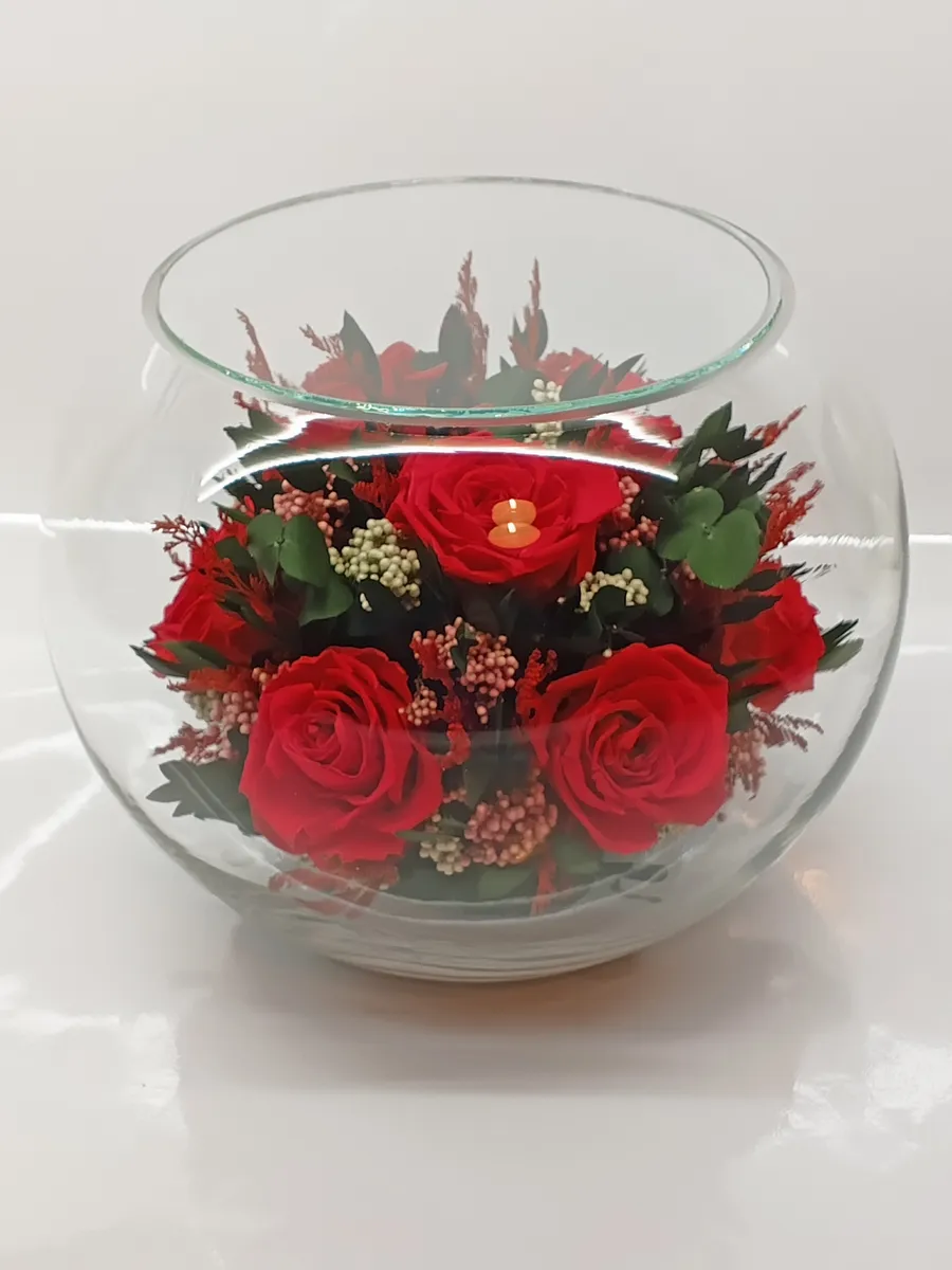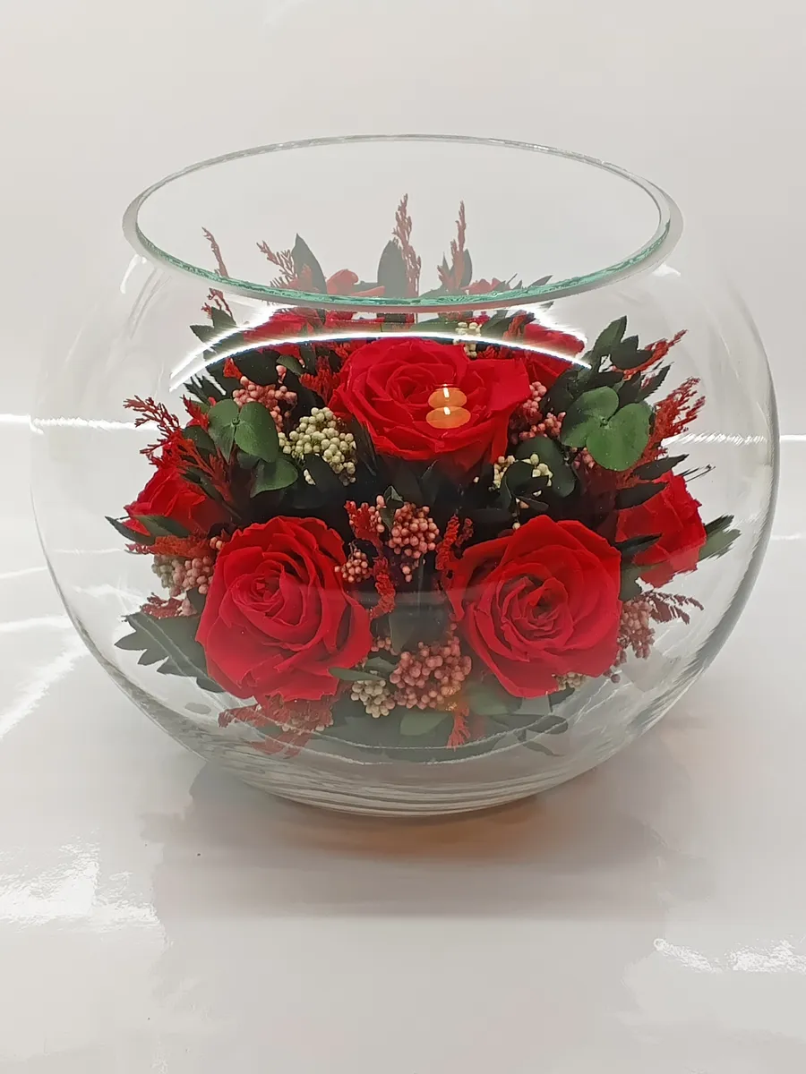 Композиции из натуральных цветов, в стеклянных герметичных вазах, вакуум.