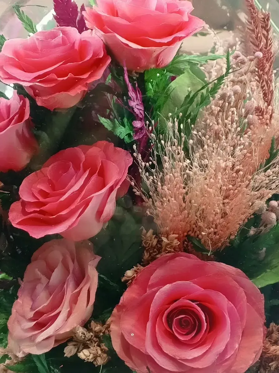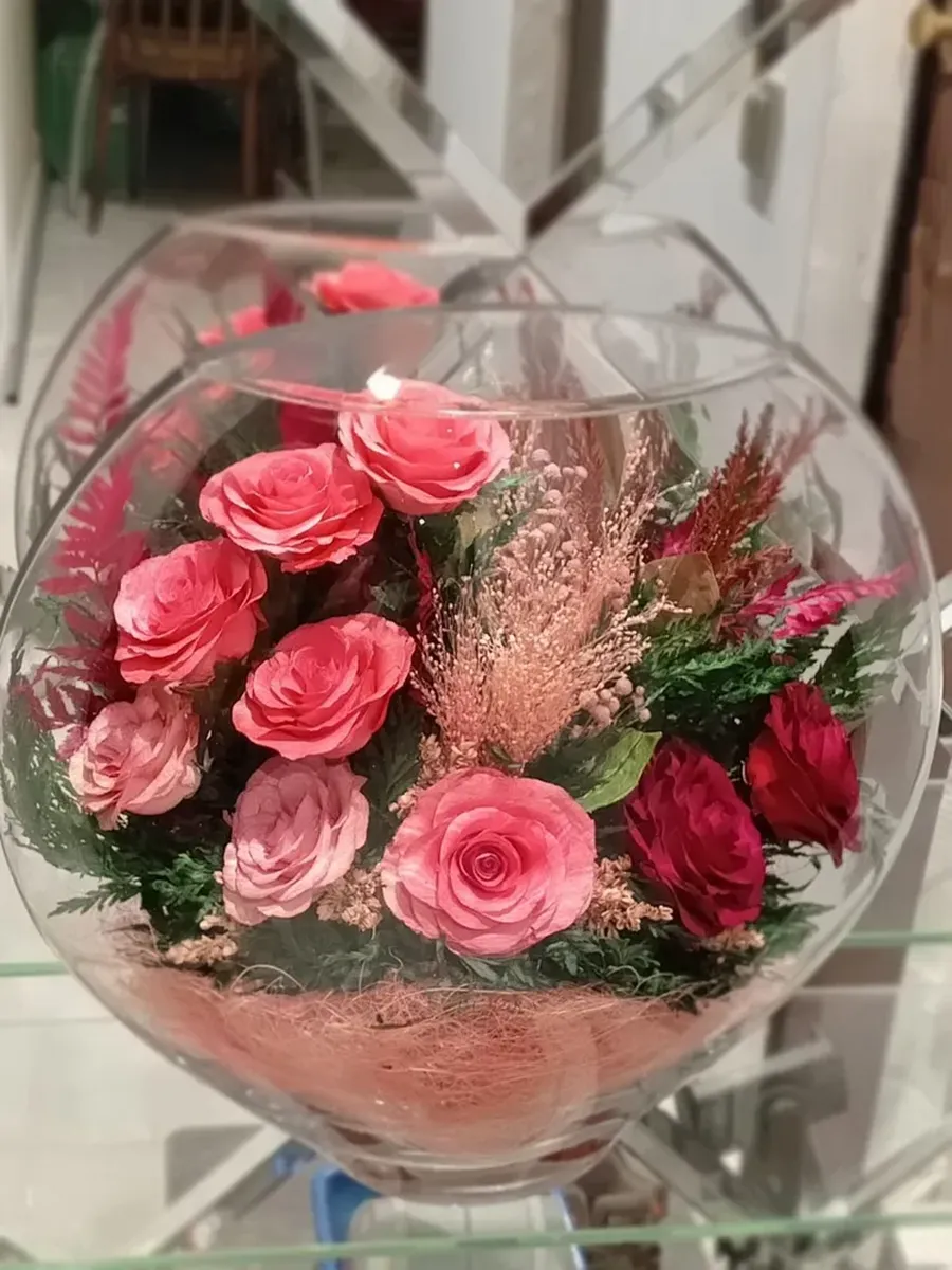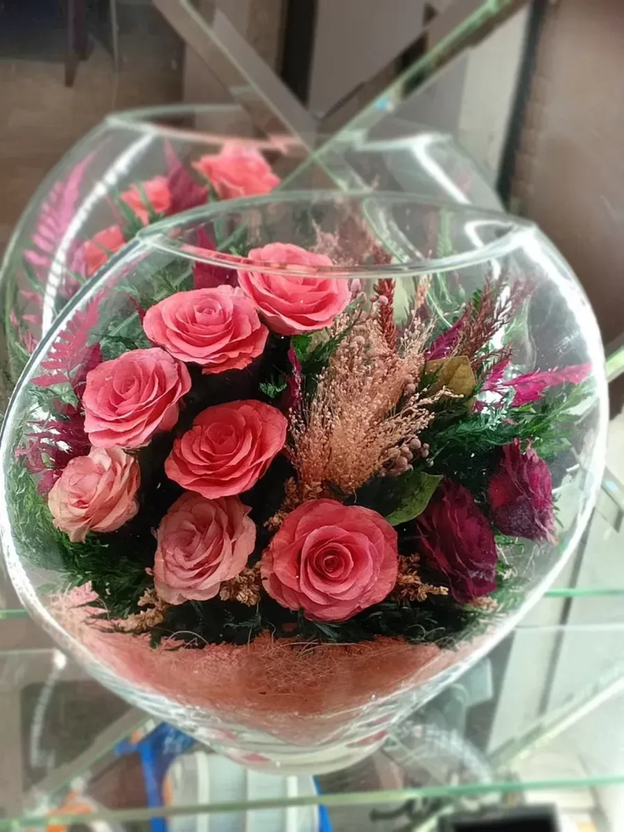 Композиции из натуральных цветов, в стеклянных герметичных вазах.