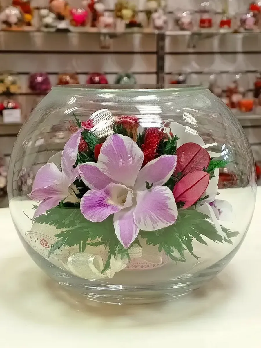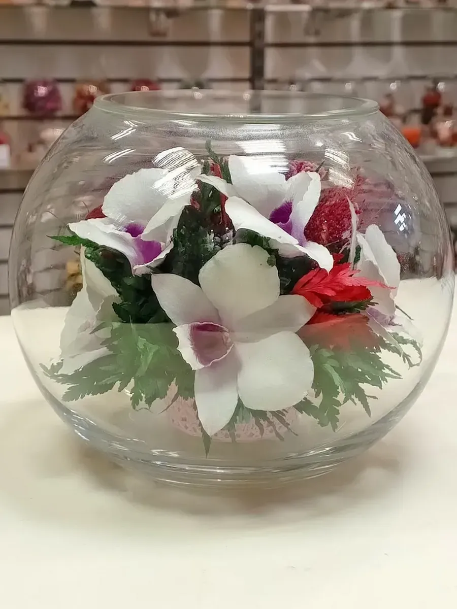 Композиции из натуральных цветов, в стеклянных герметичных вазах.