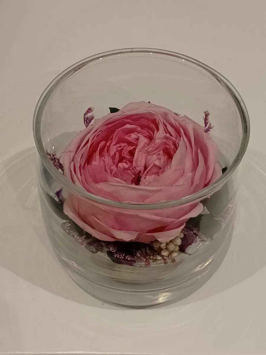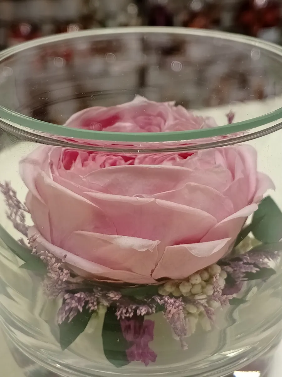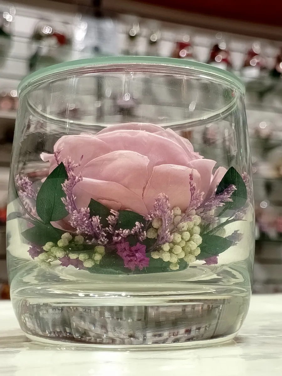 Композиции из натуральных природных цветов, в стеклянных герметичных вазах, вакуум.